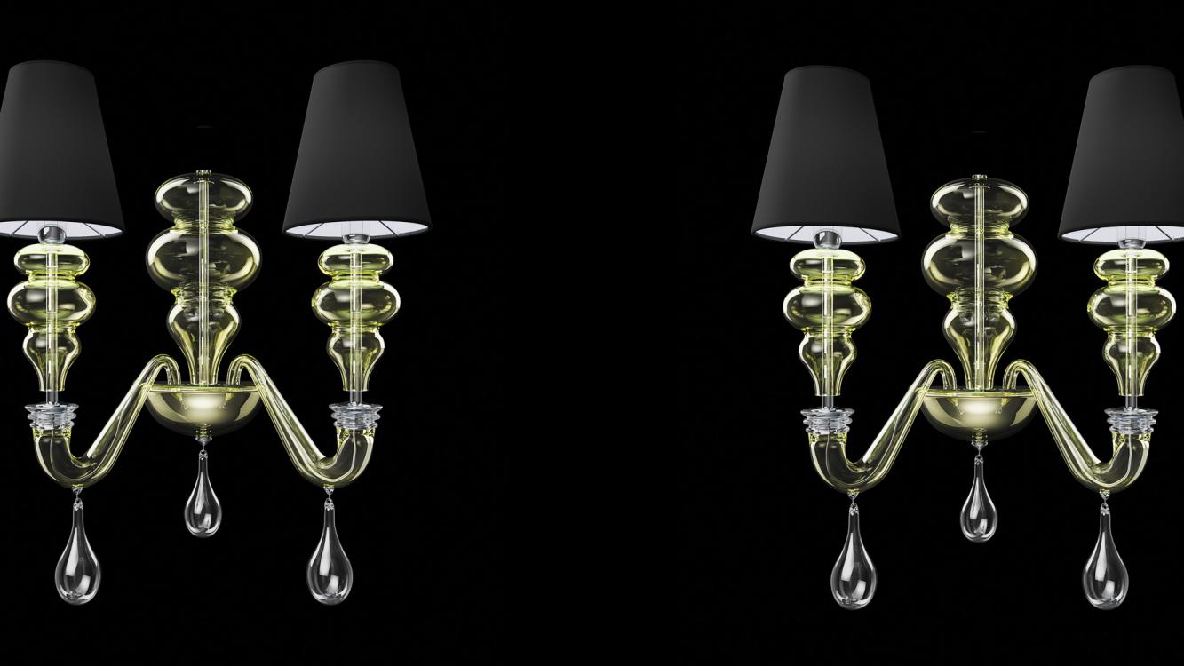 Transparency and lightness. Thanks to the wide curves of the arms, the mouth blown ogives aligned in series and the extra size drop-shaped pendants, the wall sconce appears extremely slight and delicate.