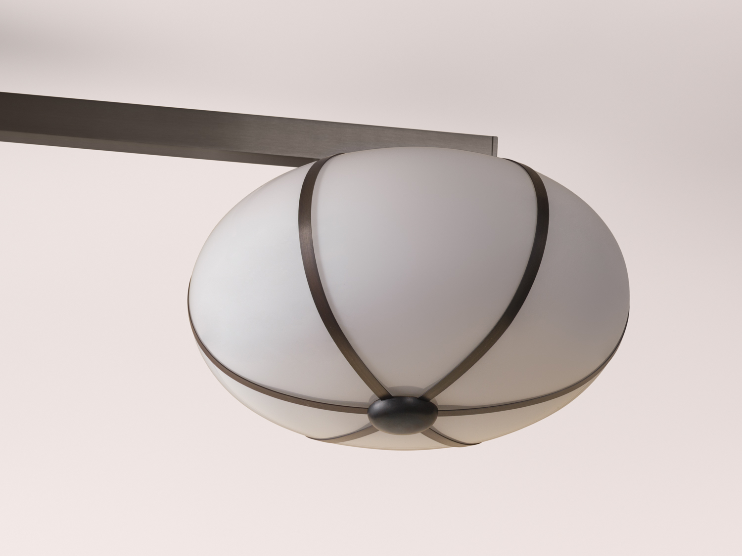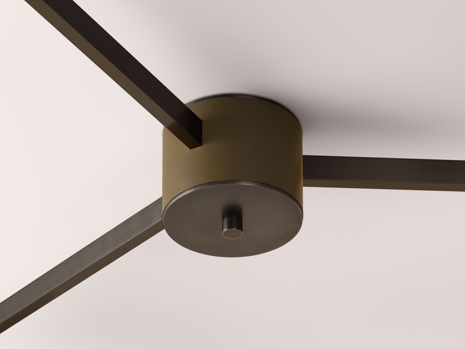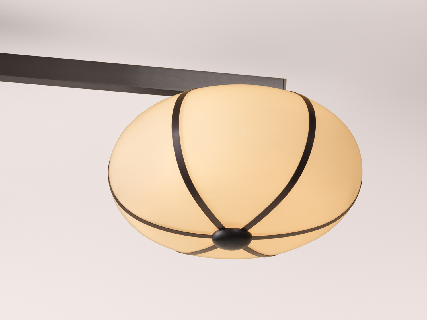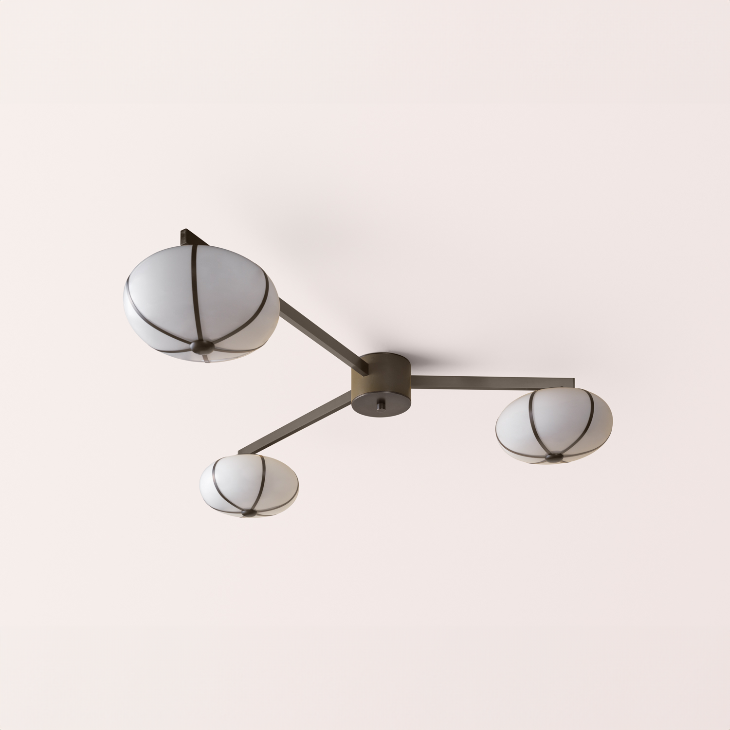 The Rib Chandelier is anchored by a cylindrical core, hand-wrapped in leather or suede. Glass pendants, framed by slender brass ribs, extend outward to form a balanced constellation of texture, structure, and light. Available with 3 or 6 pendants, as either a flush mount or a suspended fixture.