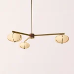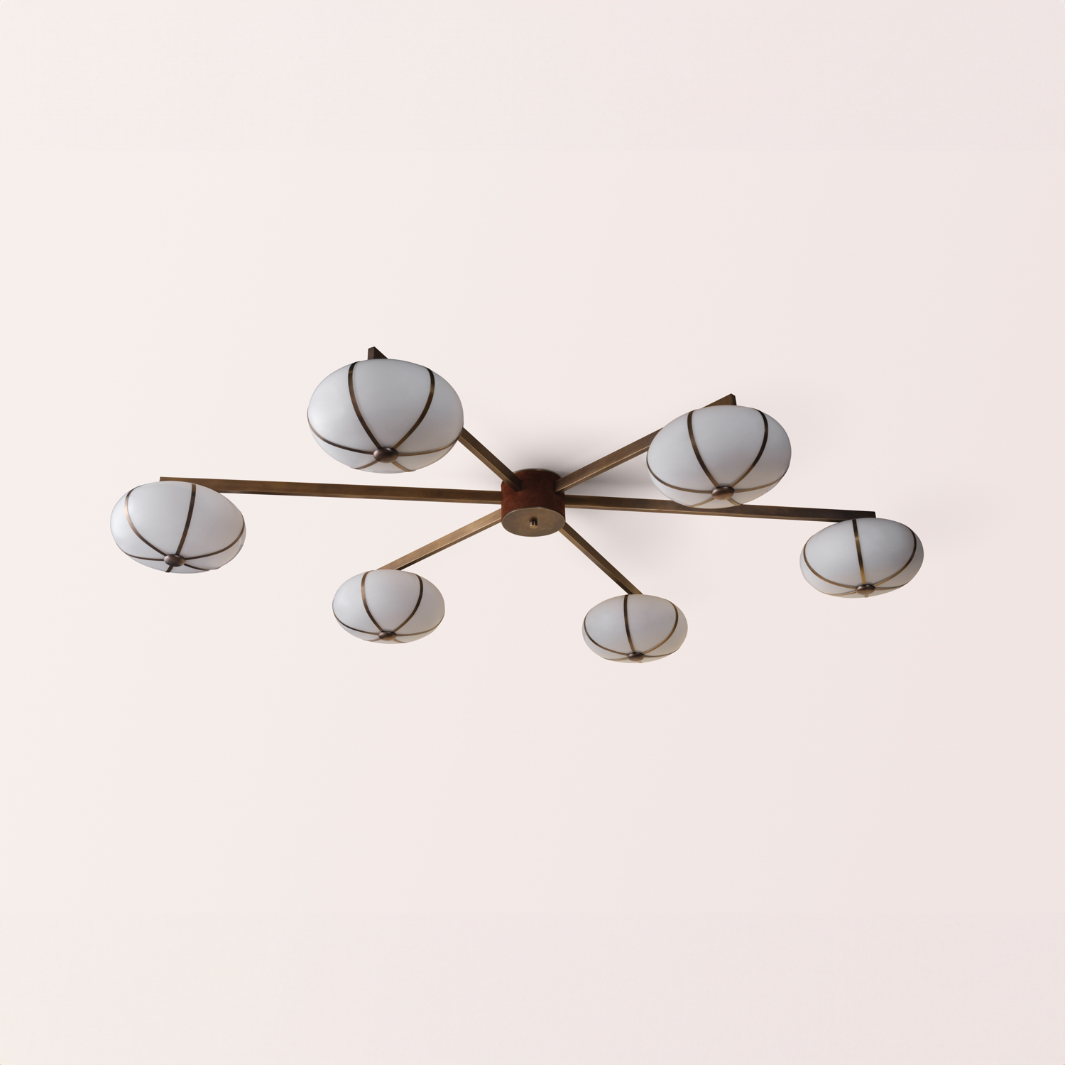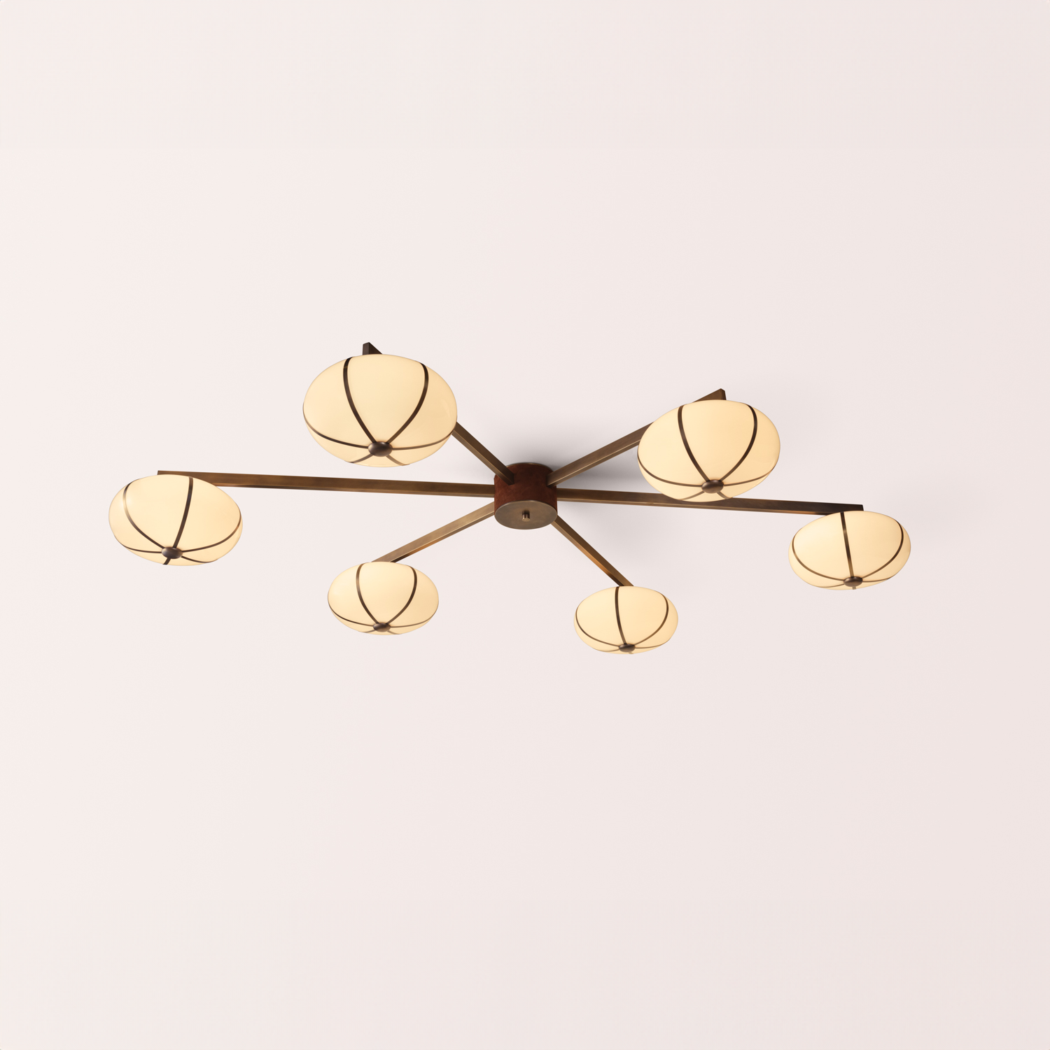 The Rib Chandelier is anchored by a cylindrical core, hand-wrapped in leather or suede. Glass pendants, framed by slender brass ribs, extend outward to form a balanced constellation of texture, structure, and light. Available with 3 or 6 pendants, as either a flush mount or a suspended fixture.