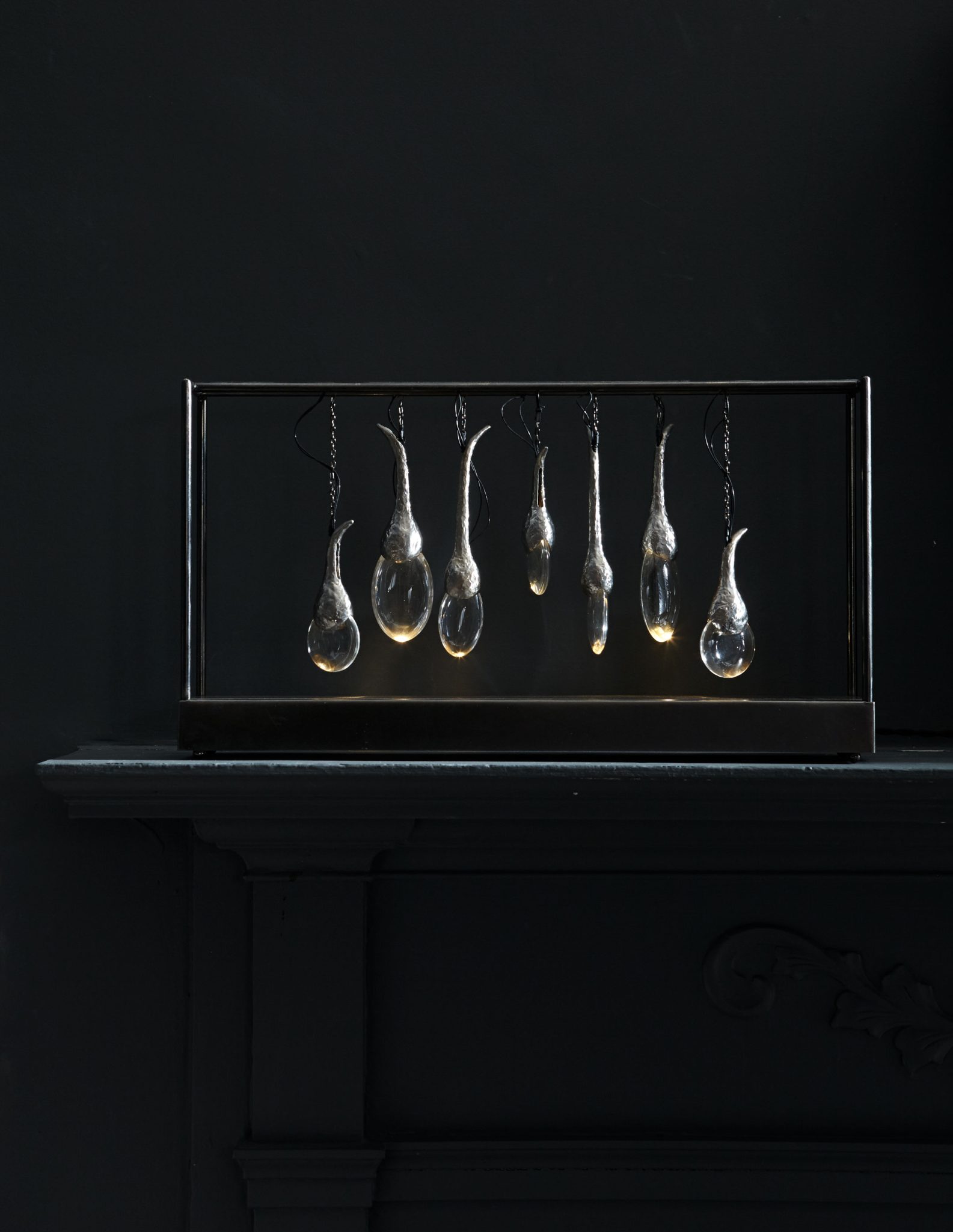Table installation with blackened nickel frame and solid cast bronze buds, each housing a glass drop illuminated by LED.