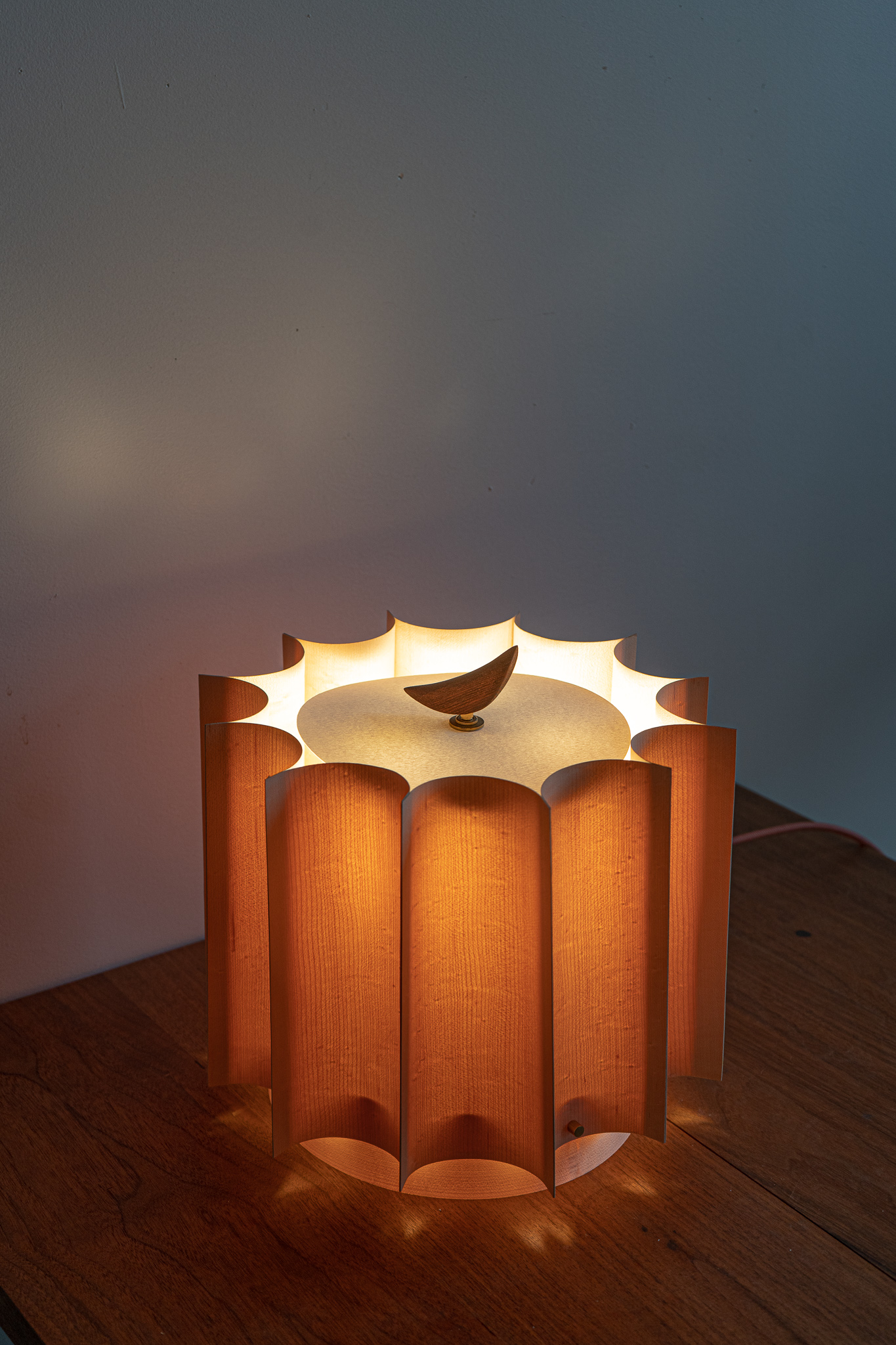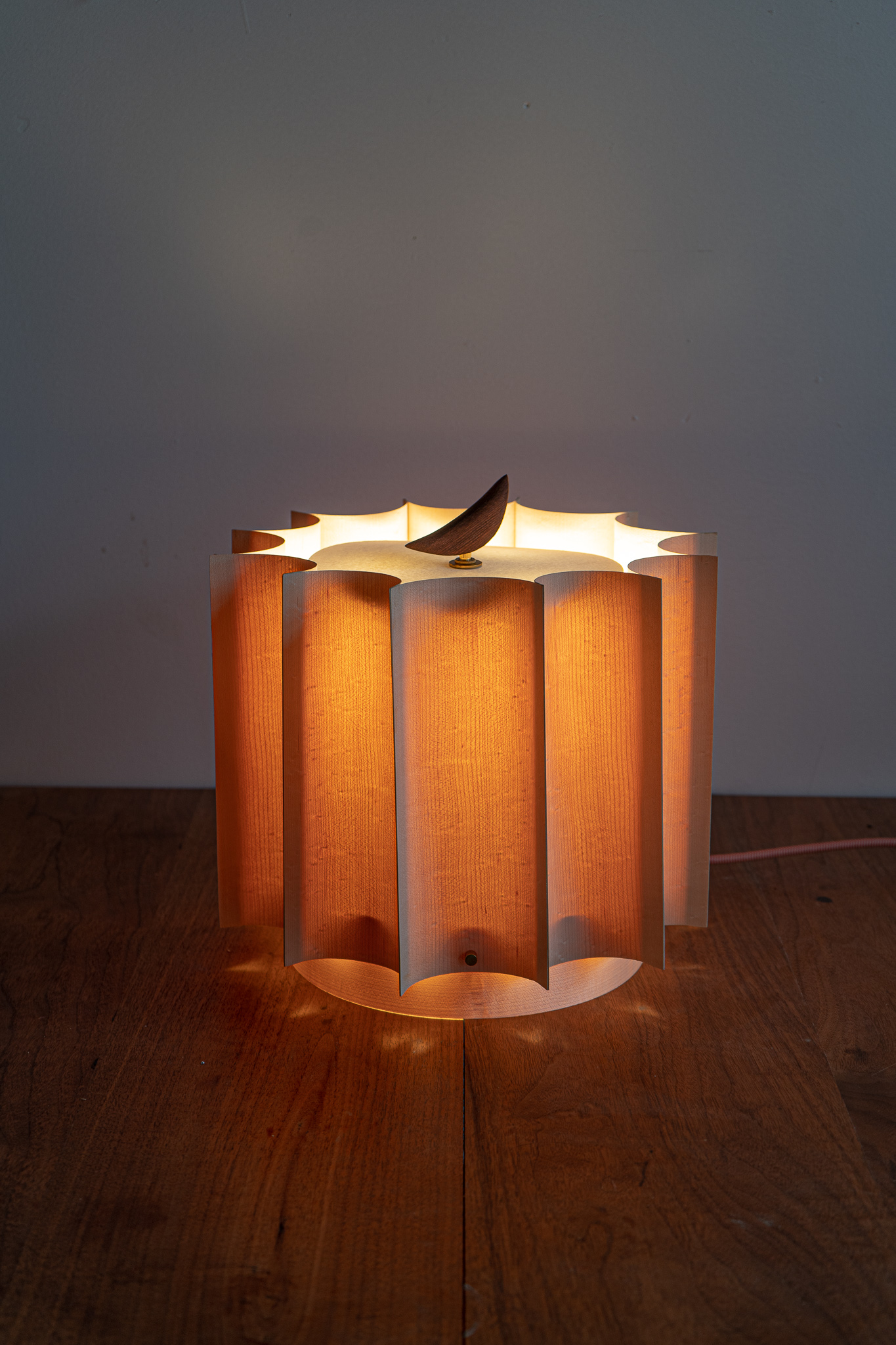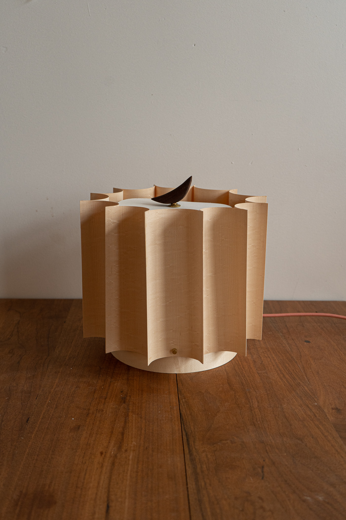 Wood has memory, it was part of a mighty tree, cells arranged and flowing together. When cut, this memory remains. Maple veneer is dipped in water to allow the cells to curl back, to remember thus creating the fluted curves of the piece.