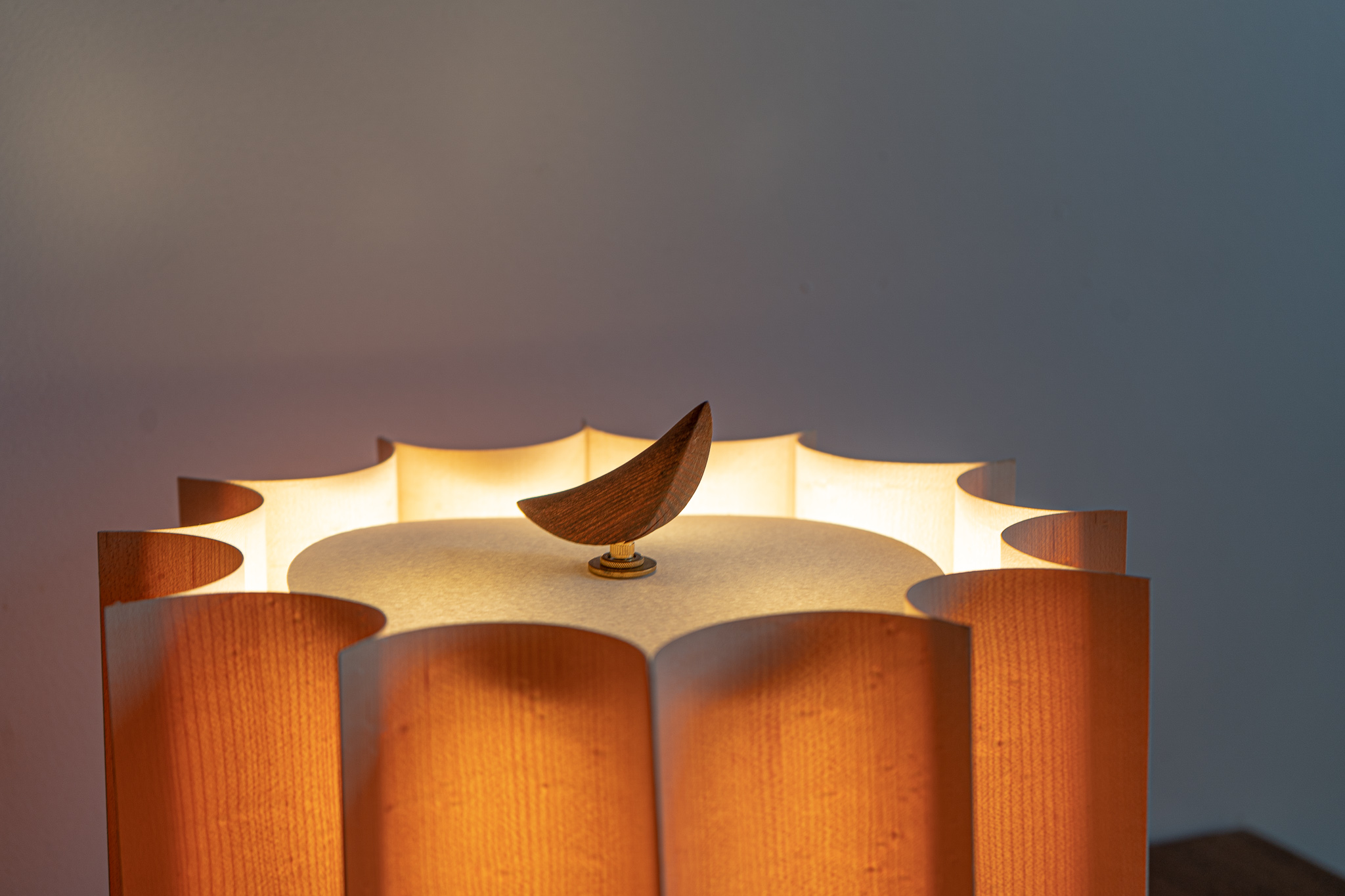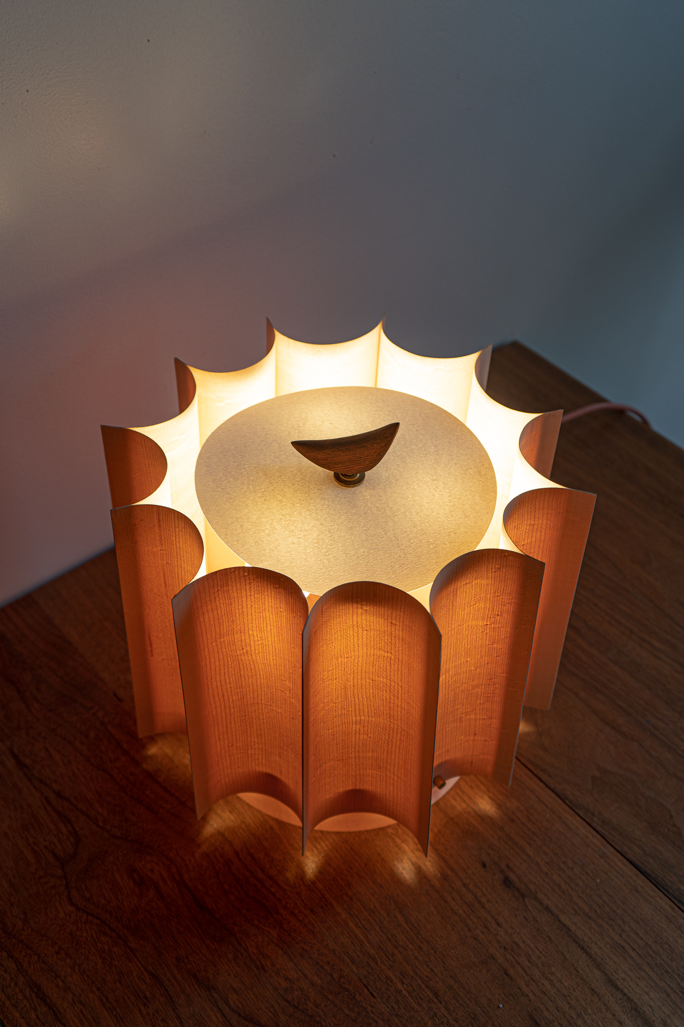Materials: Maple Veneer, Redwood, Brass hardware, Lighting components, Natural finish.