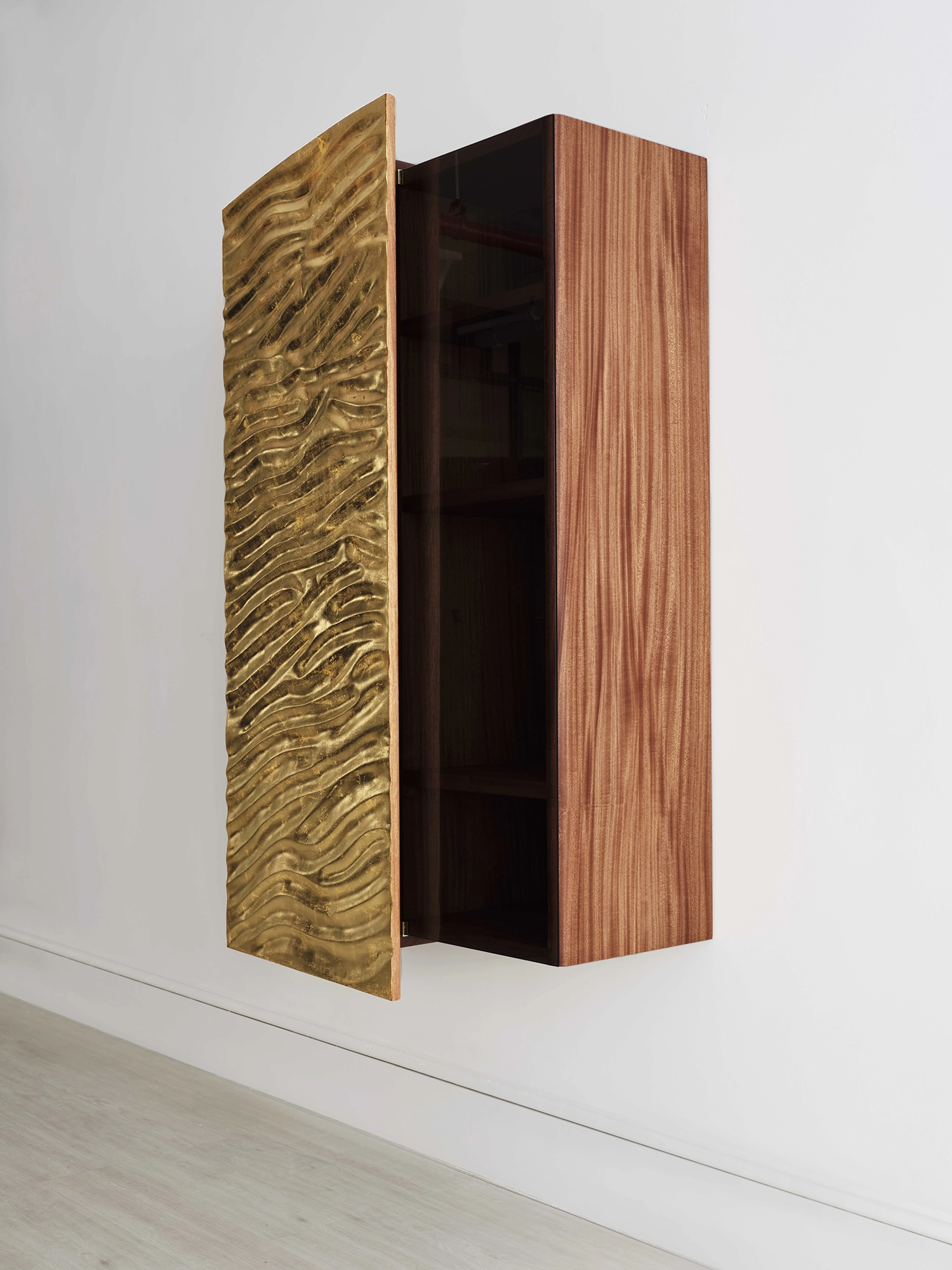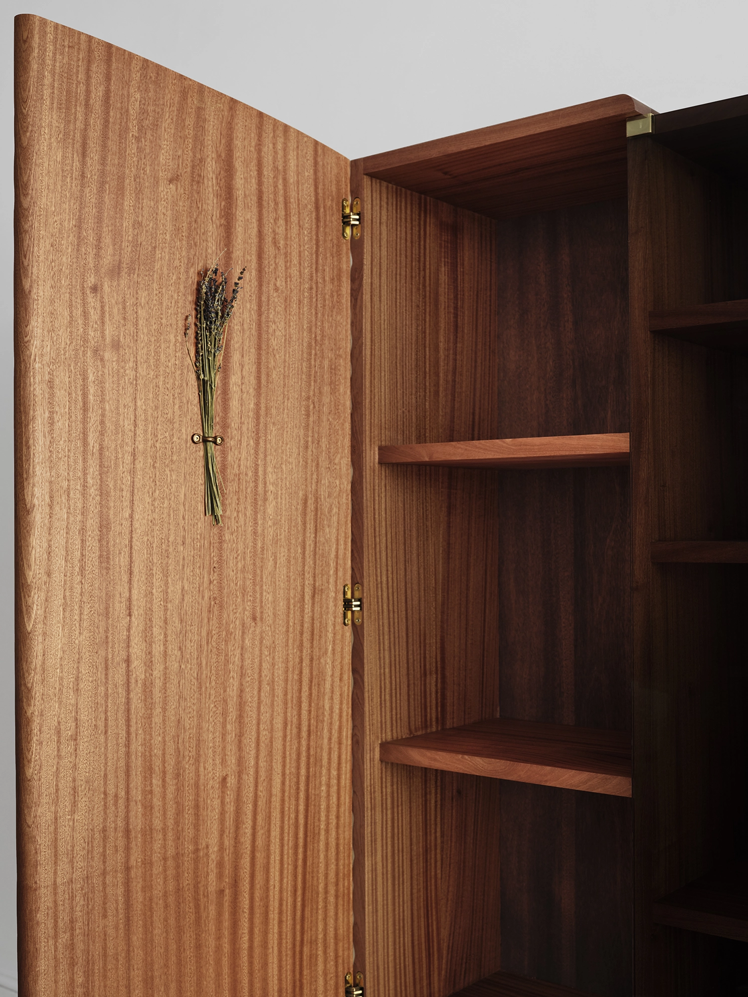 The piece is wall hung to float in any space. It offers half full concealment of items and half partially screened, presenting an opportunity for thoughtful curation of cherished objects and talismans. Inside is special bronze hardware meant to hold lavender. A flower which poses both practical and poetic functions for the piece.