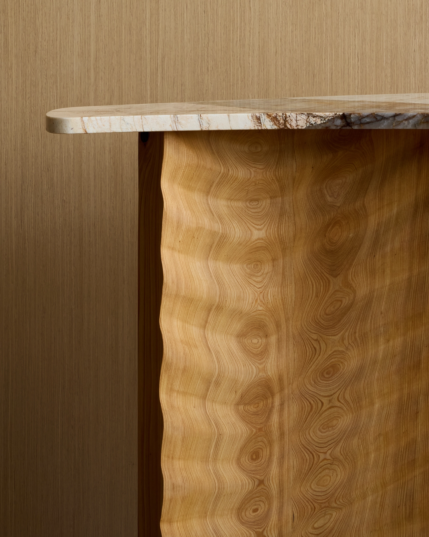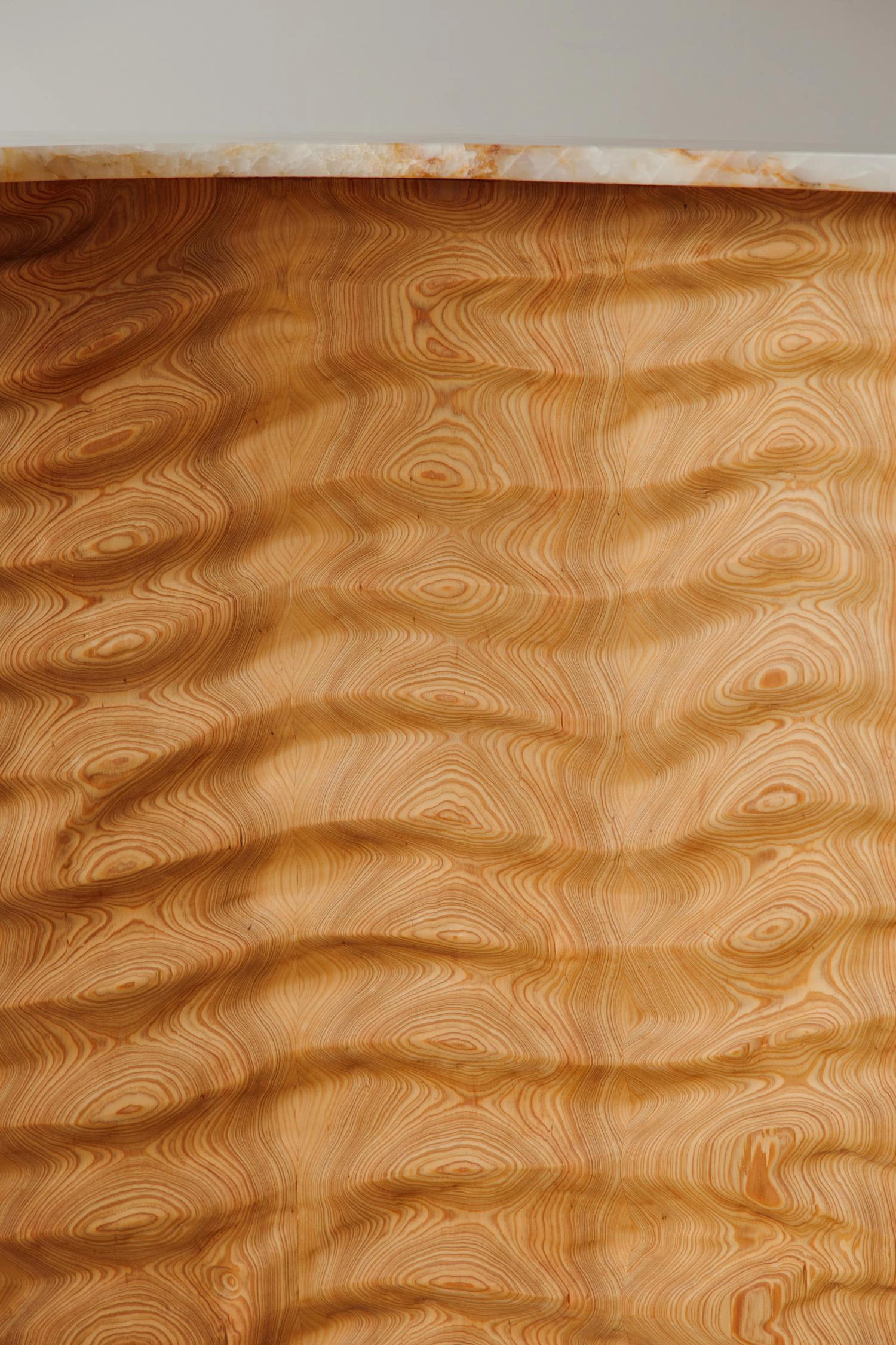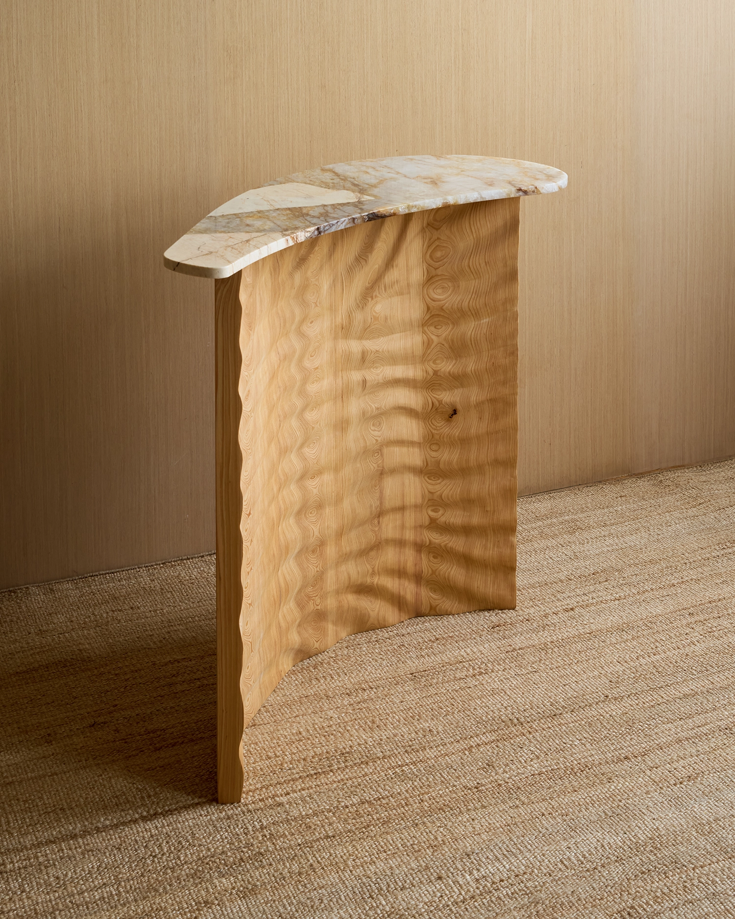 The Tides console is a memory carved into wood. The wood base is constructed with the stave method derived for barrel making. The wave motif is hand carved into the wood creating depth and unexpected interaction between relief and grain.