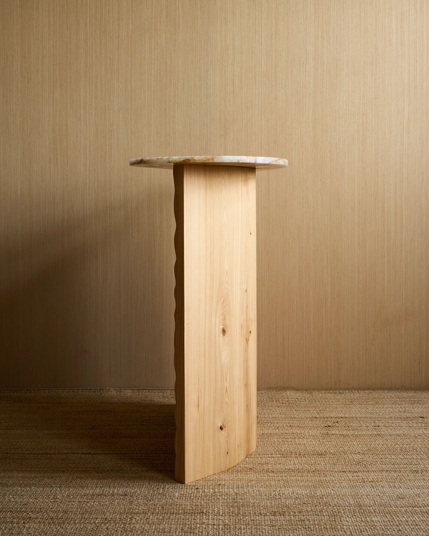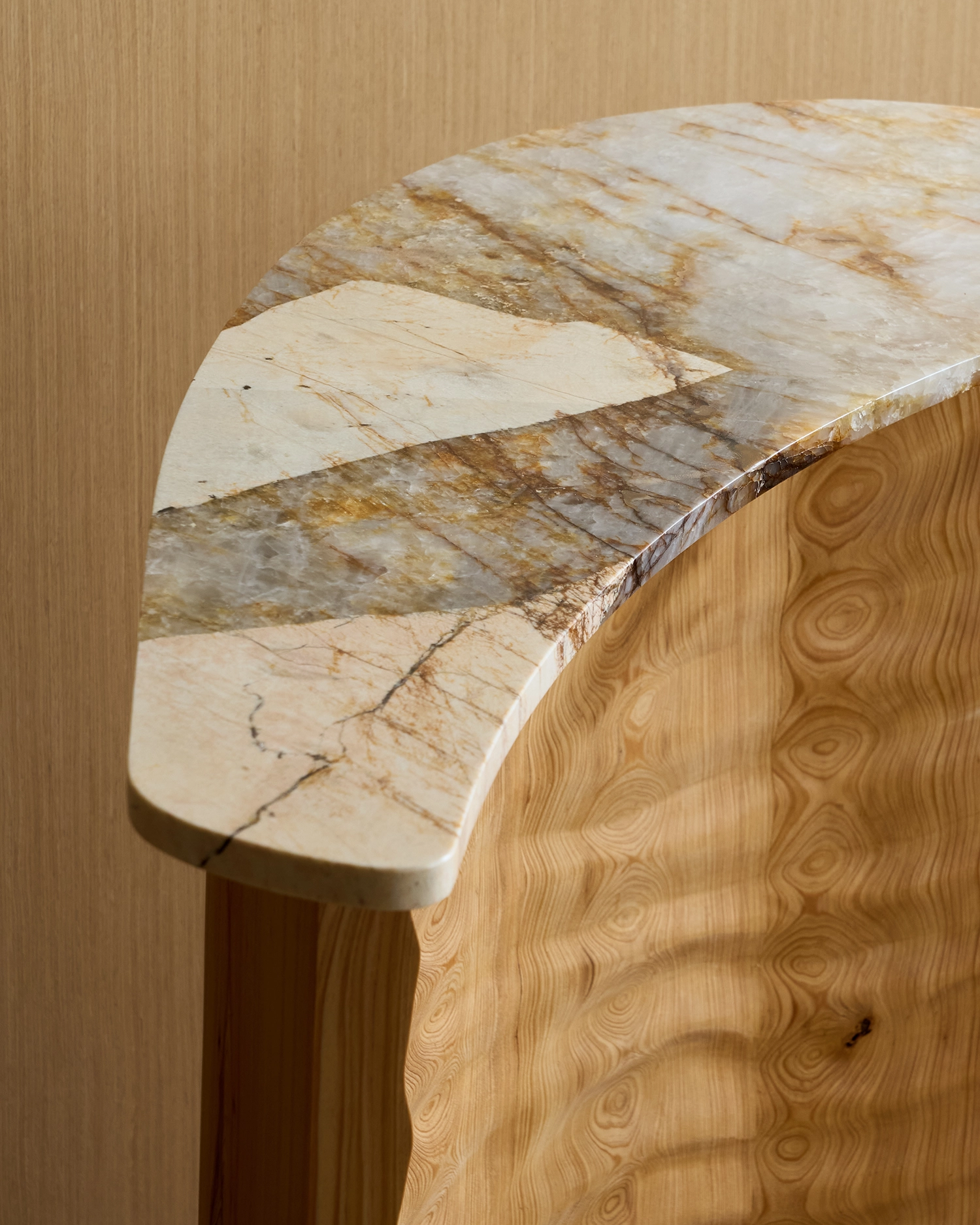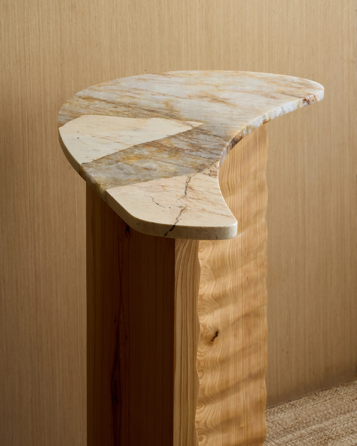 The Tides console is a memory carved into wood. The wood base is constructed with the stave method derived for barrel making. The wave motif is hand carved into the wood creating depth and unexpected interaction between relief and grain.