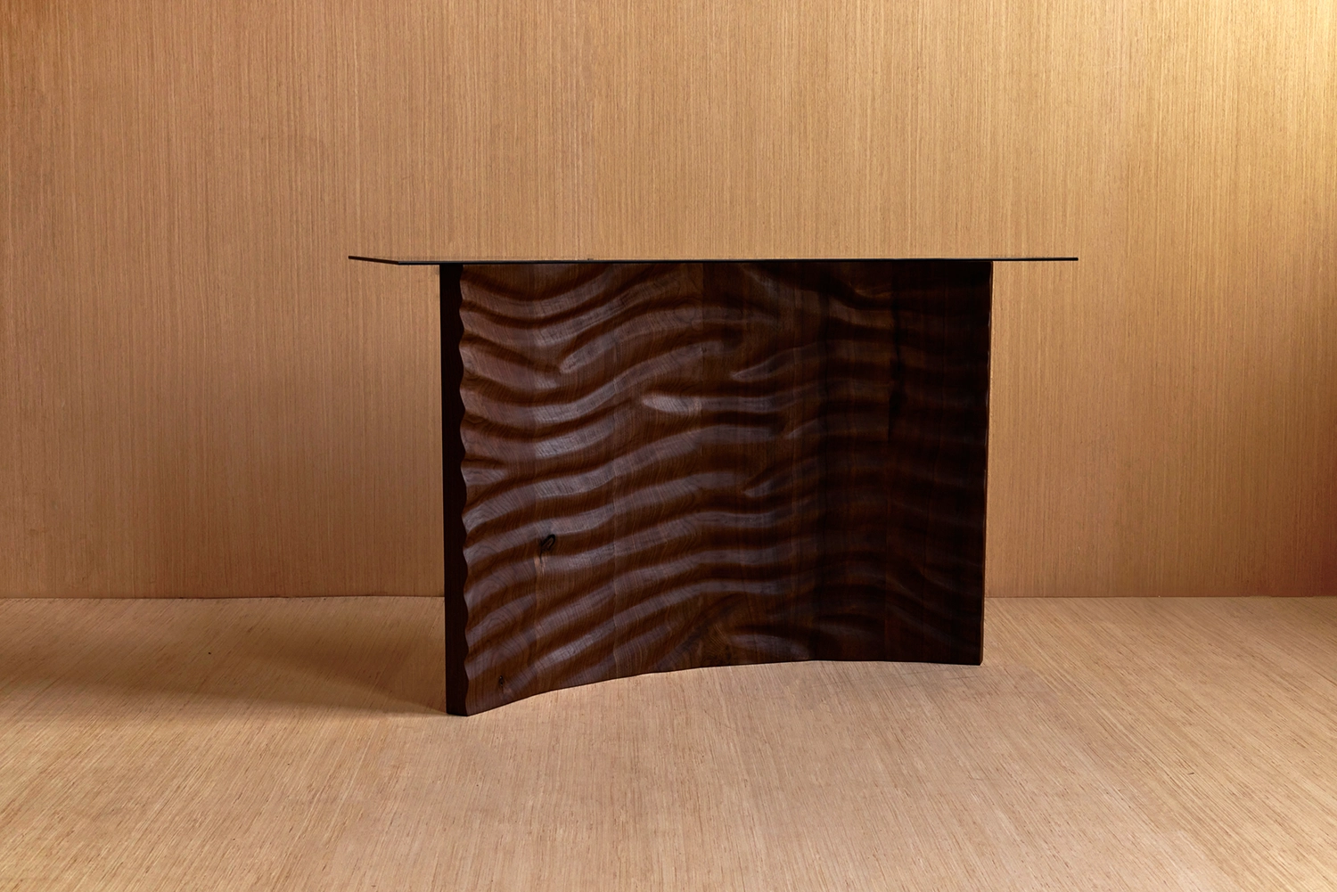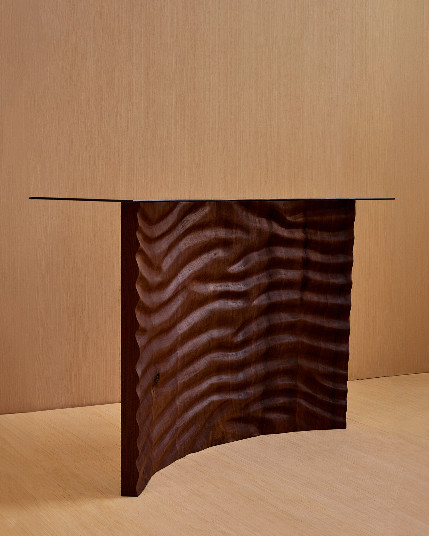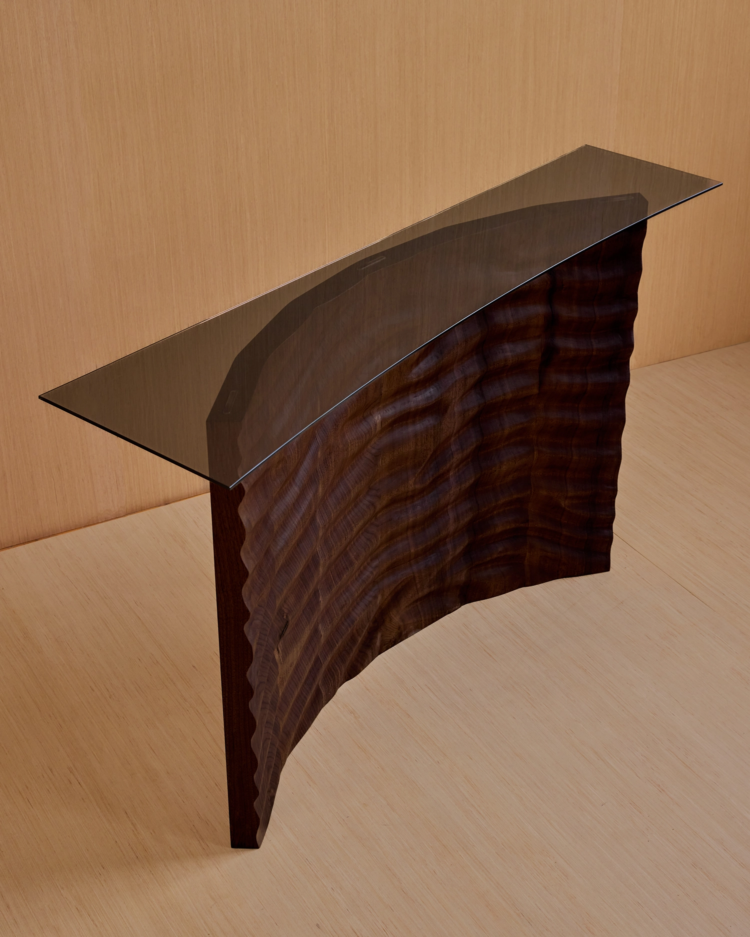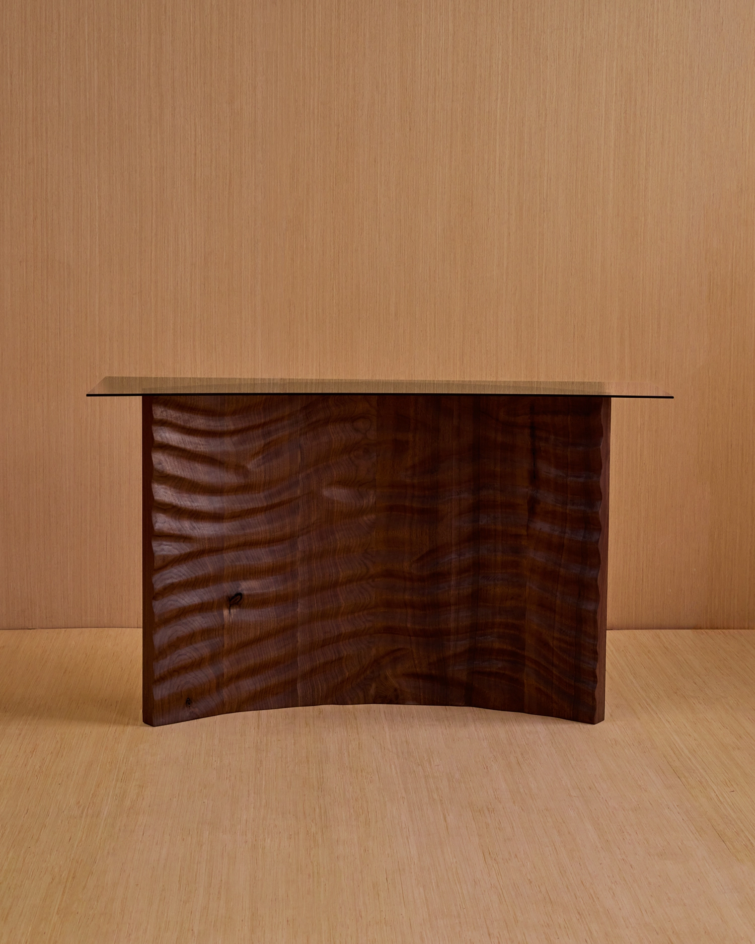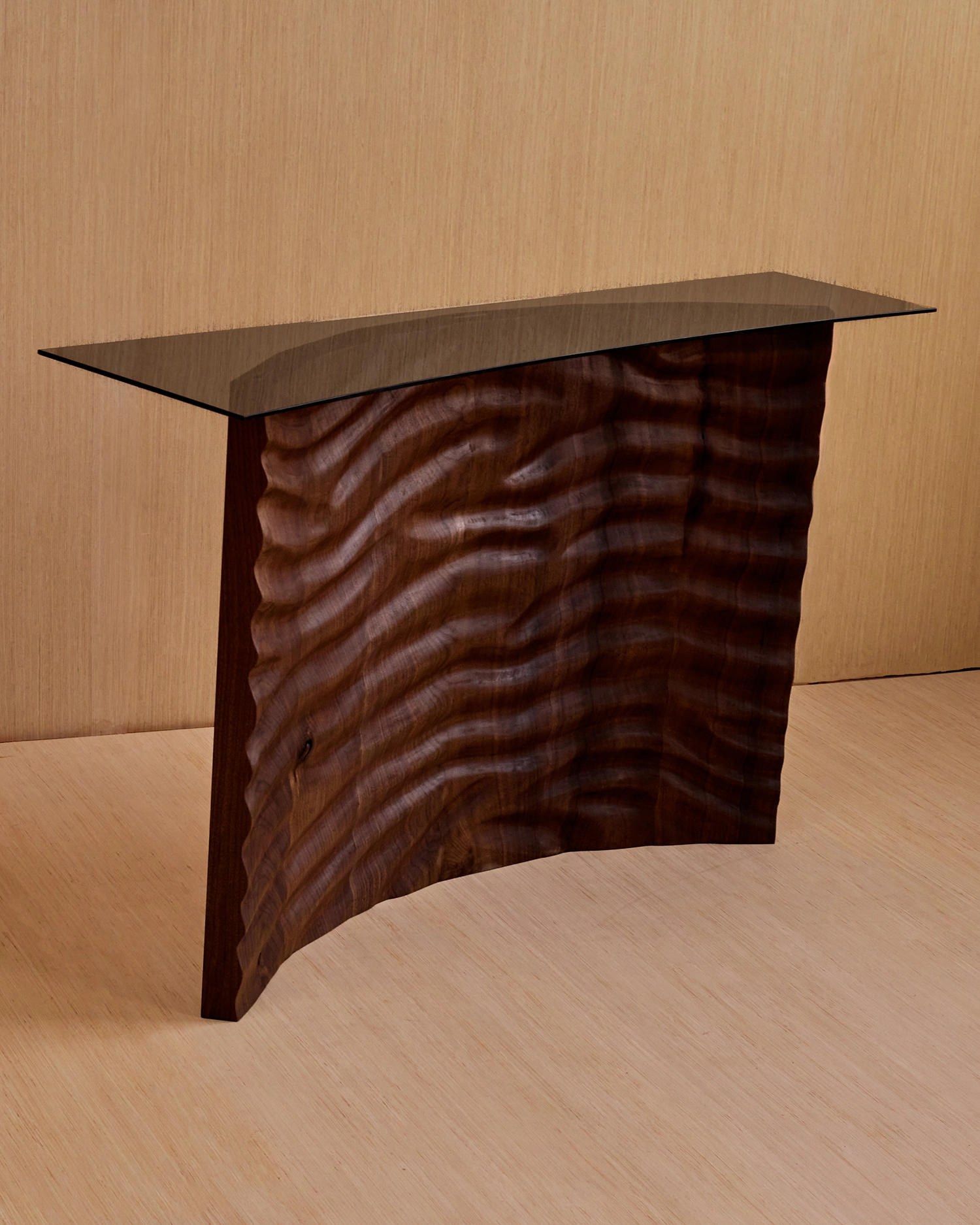 The Tides console is a memory carved into wood. The wood base is constructed with the stave method derived for barrel making. The wave motif is hand carved into the wood creating depth and unexpected interaction between relief and grain.