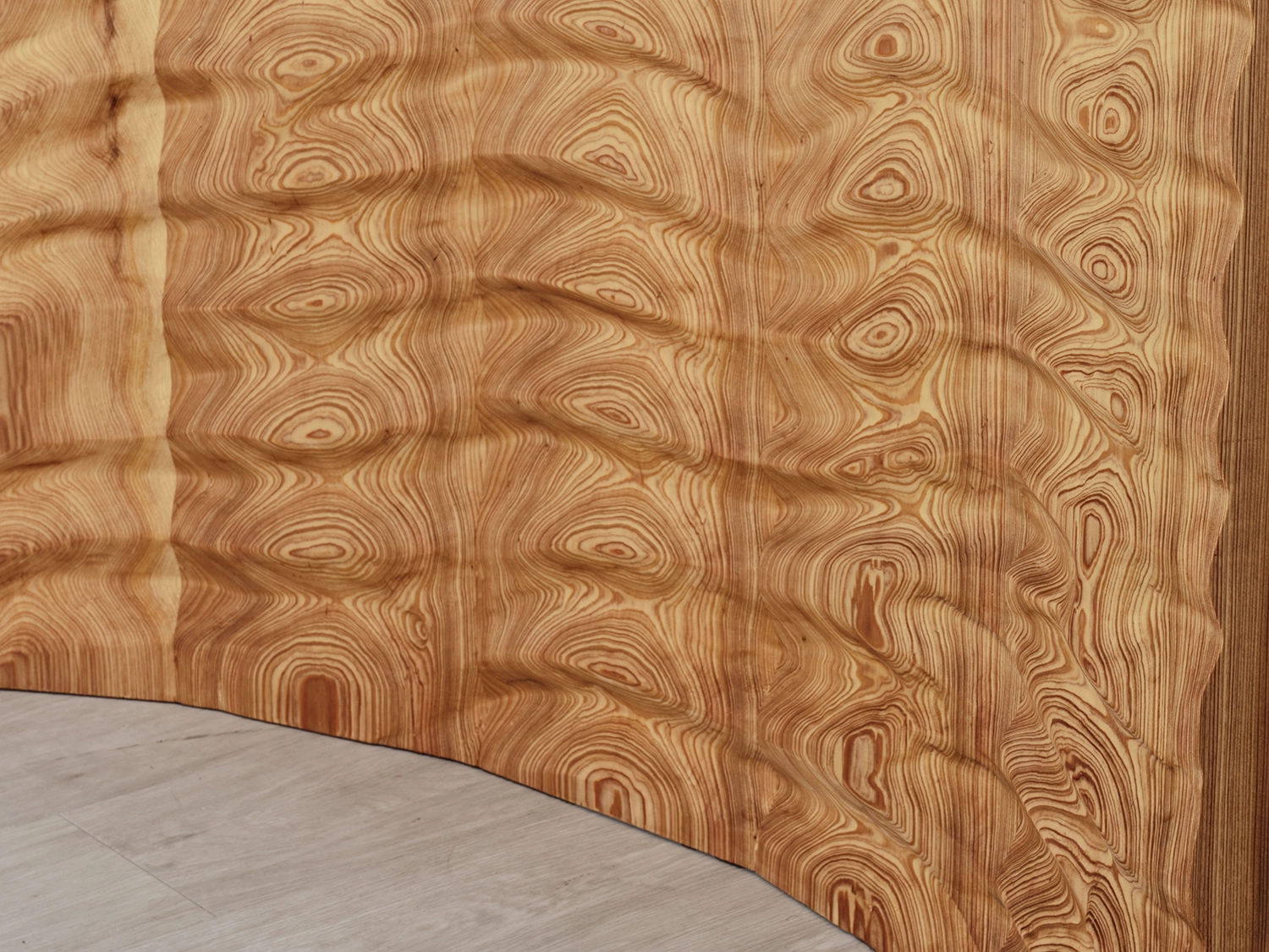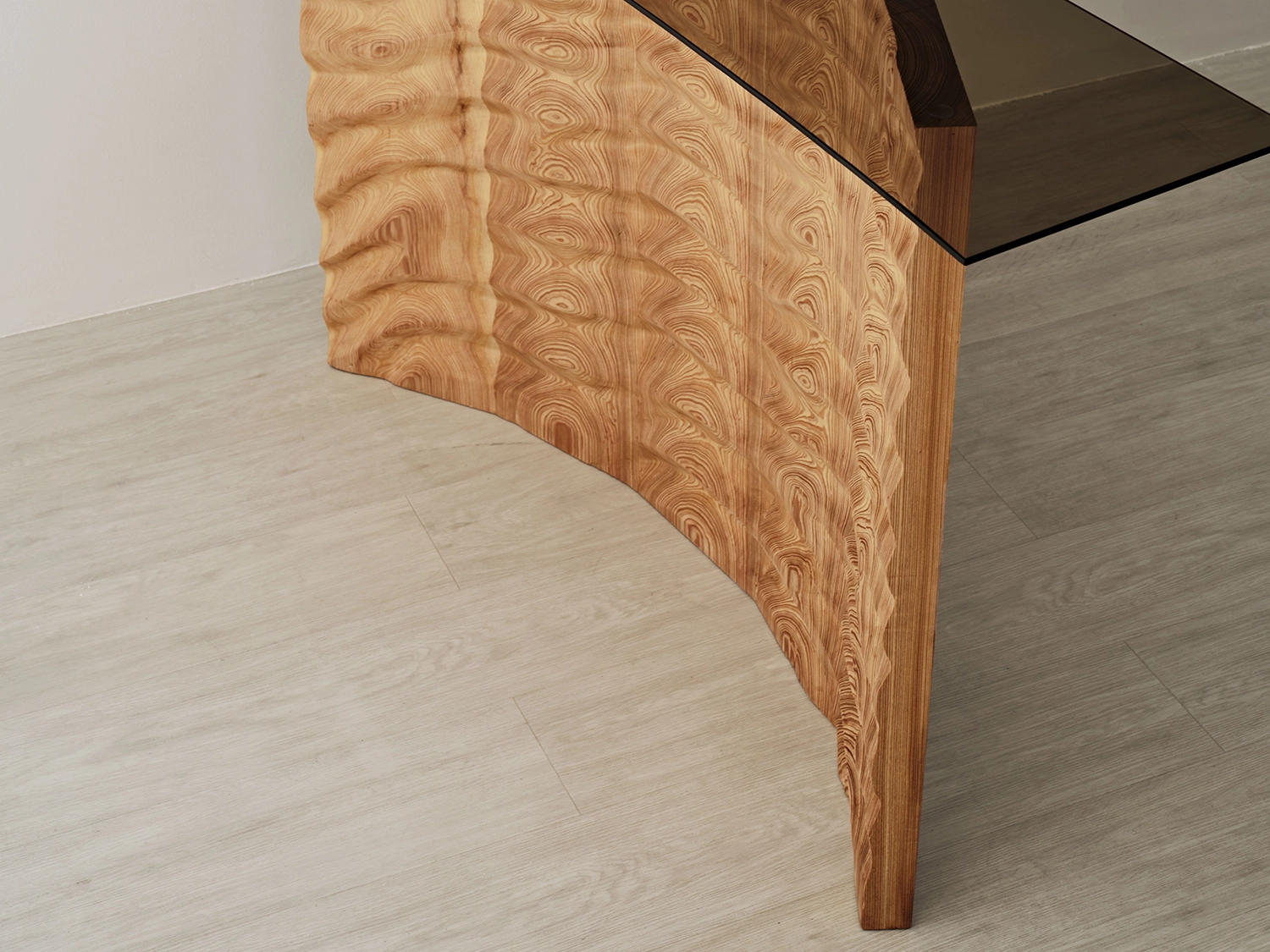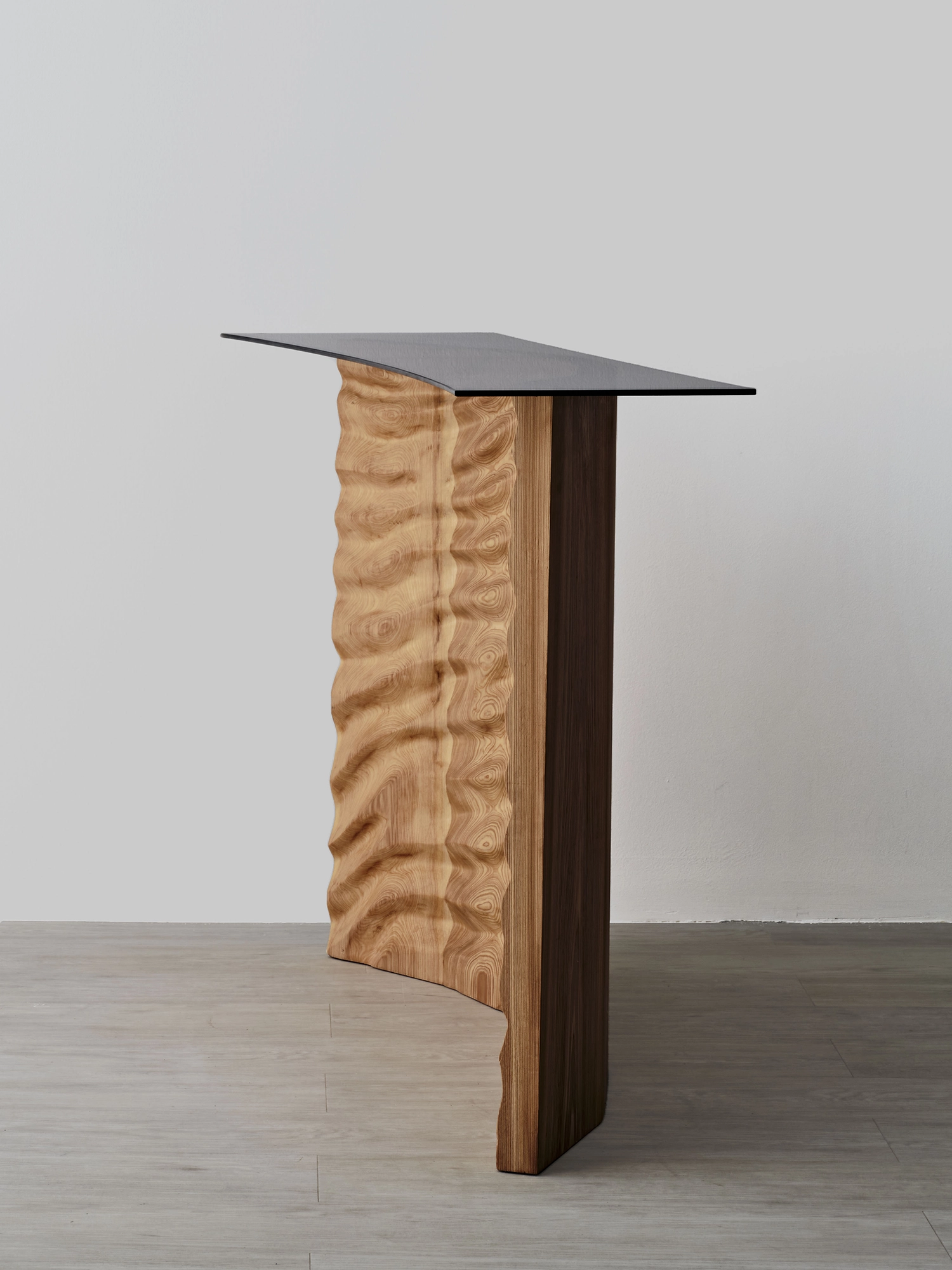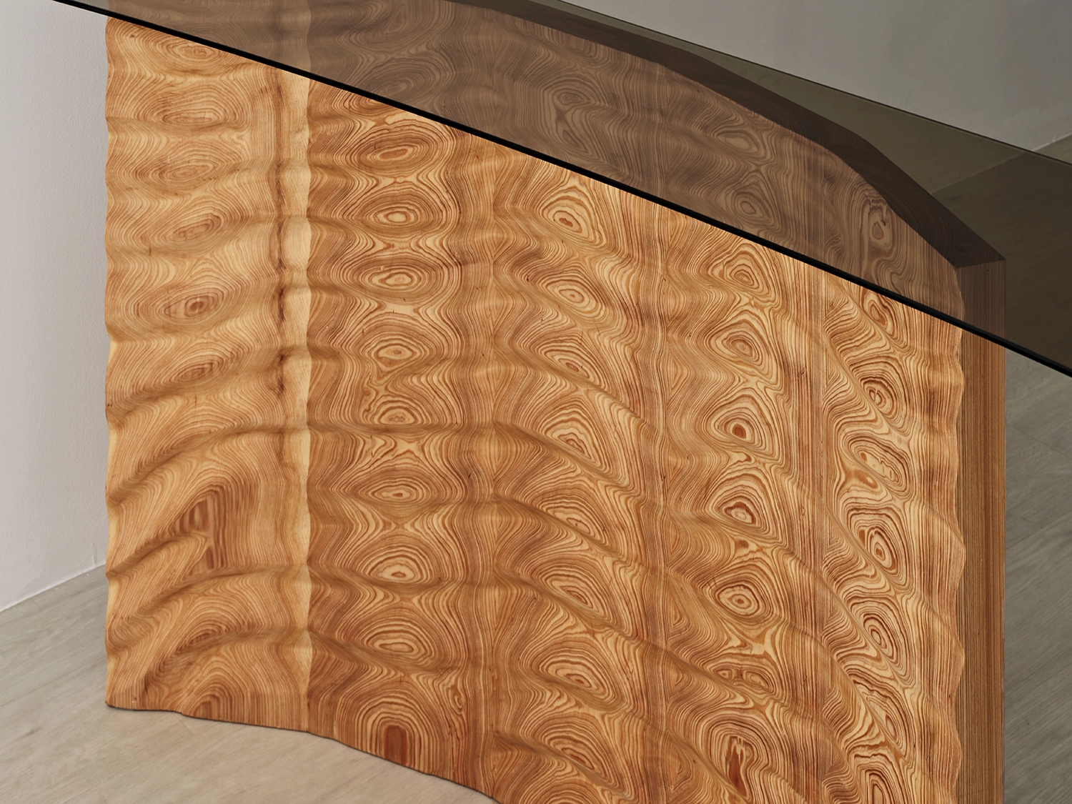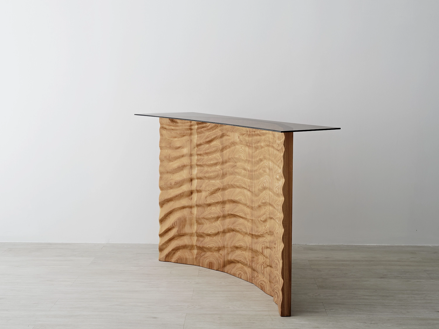 The Tides console is a memory carved into wood. The wood base is constructed with the stave method derived for barrel making. The wave motif is hand carved into the wood creating depth and unexpected interaction between relief and grain.
